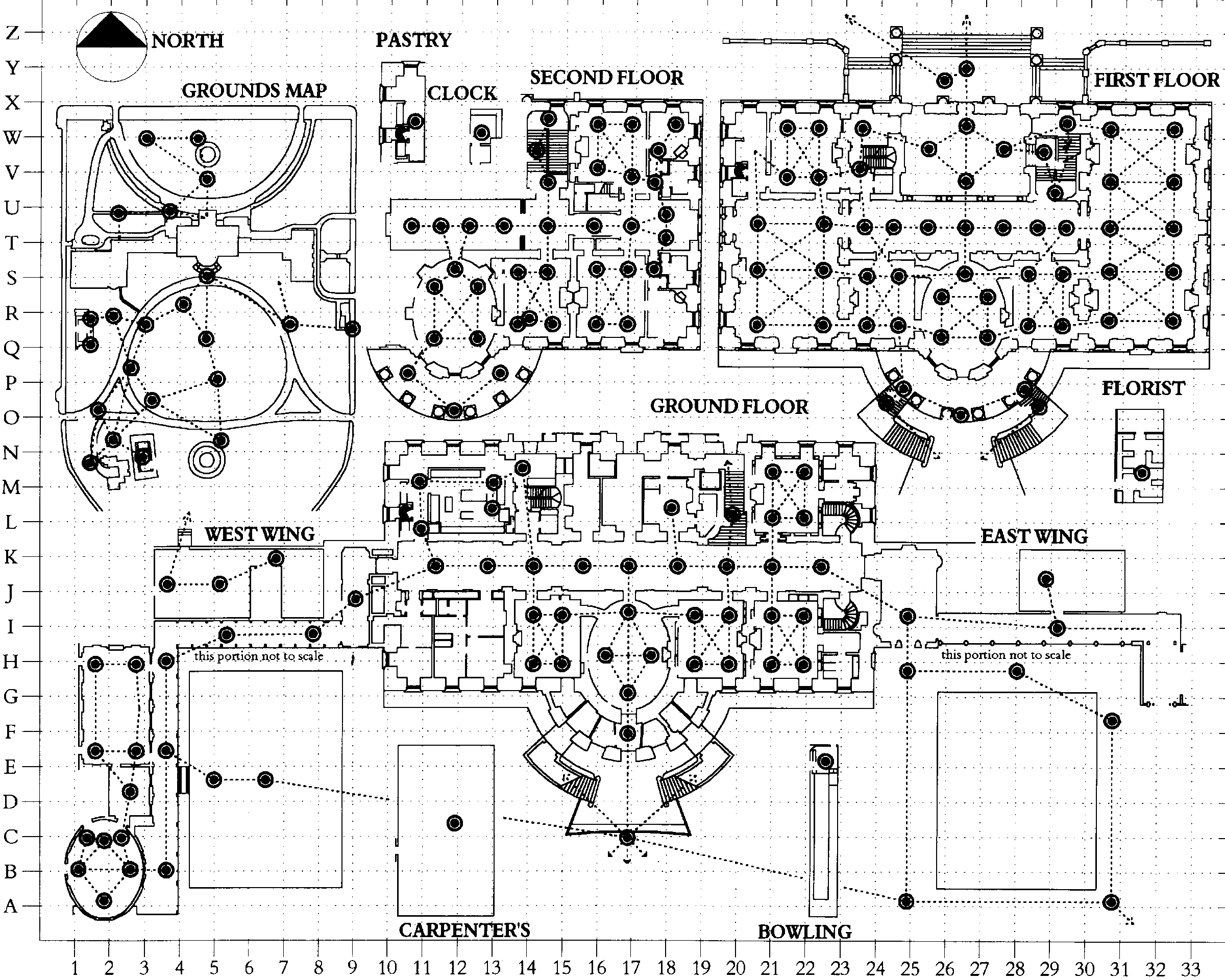 Note that this is the same map used in designing the program, and that a few more links were added prior to publication. Also note that the location of the various maps has nothing to do with their actual locations on the White House Grounds. Part of our process required that we produce a single map with all of the nodes on it. Many location compromises were made, including the shortening of the East and West Colonnades to fit the East and West Wings onto the map, and the sprinkling of space such as the Clock Shop and Pastry Shop into available space. This is a scan from a 42" wide plot hanging in our office, which was used to track the progress of the work on each node. The black circles were originally push-pins, and the dashed lines string.